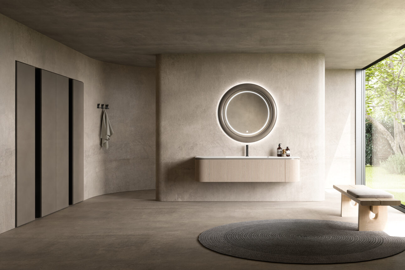 Il progetto si completa con il top in gres Marble Mahal con vasca integrata, che rafforza l’idea di un volume monolitico e continuo, e con lo specchio Polo, caratterizzato da cornice laccata Steel Bronze e illuminazione LED dimmerabile. L’introduzione dell’armadio nella stessa finitura metallica amplia ulteriormente la composizione, definendo un ambiente coerente e organizzato. Questa evoluzione si inserisce in una visione più ampia del bagno, un ambiente sempre più centrale nella casa, dove progettare significa interpretare esigenze concrete e trasformarle in qualità dell’esperienza.