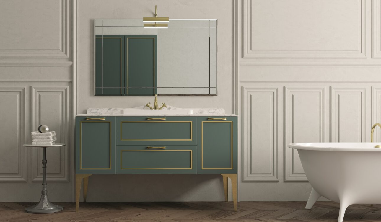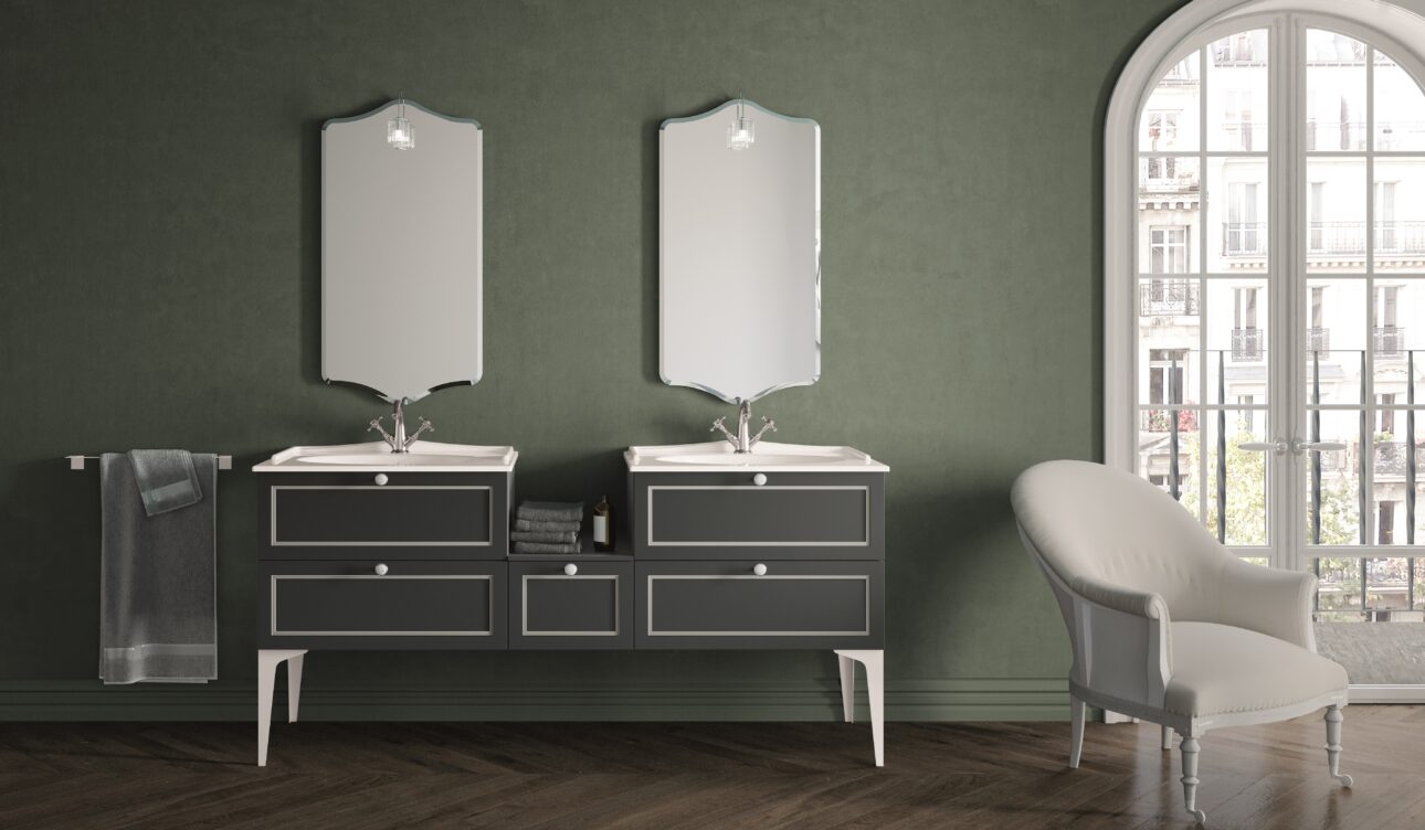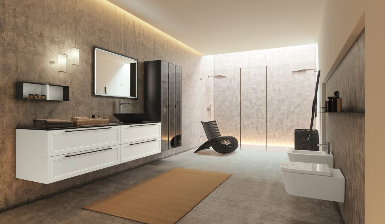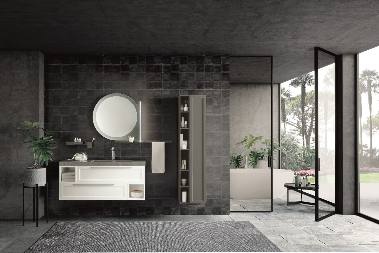 Nella composizione 07, il conservatorismo è interpretato con una nota più decisa. Il contrasto tra le basi Bianco opaco e il top in gres Nero Greco è calibrato, preciso, come un taglio sartoriale. Il lavabo in ceramica nera opaca e le colonne con vetro fumé incorniciato in alluminio Titanio raccontano una visione solida e rigorosa del progetto bagno, in cui modernità e classicismo si abbracciano senza frizioni. L’elemento a giorno in metallo Titanio aggiunge un tocco industriale che, lungi dall’interrompere l’armonia, la rinnova.