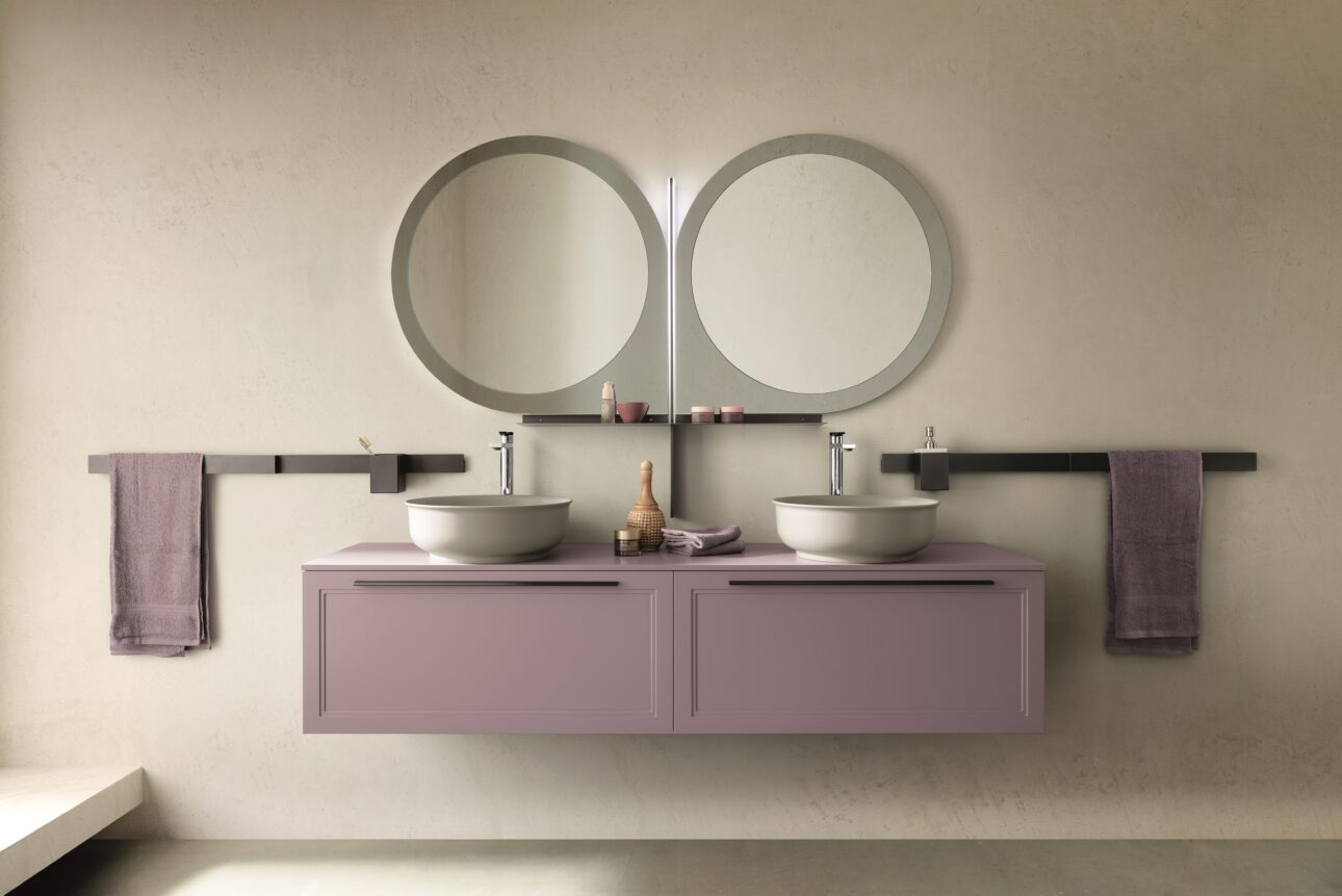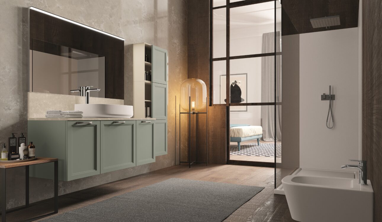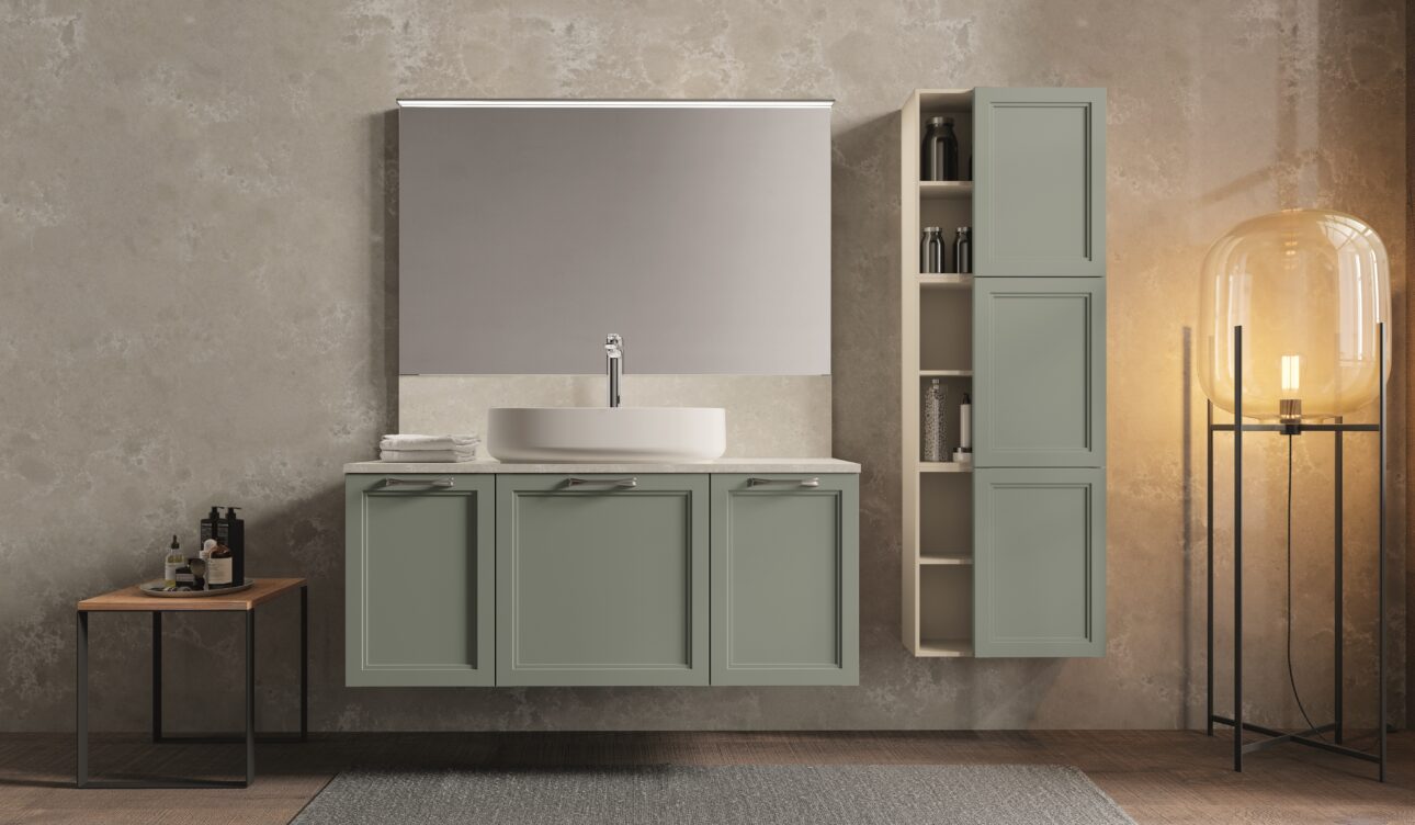 SETA è un omaggio alla grazia tonale e alla compostezza. In questa composizione (06), le basi laccate Giada opaco si accostano a pensili in finitura Juta, in un equilibrio cromatico che ricorda le palette sofisticate degli interni parigini più discreti. Il top Olympos Mist e il lavabo Elite in ceramica bianca opaca introducono texture leggere ma materiche, capaci di suggerire una contemporaneità sussurrata, mai gridata. Ogni dettaglio contribuisce a creare un paesaggio ordinato, autentico, profondamente abitabile.
