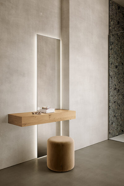 MATT BIANCO LACQUERED WITH HANDLE M31 IN WOOD FIAMMATO GRANO. TOP NORDICO NATURALE WITH GEACRYL MATT BIANCO WASHBASIN BLUES W. 52,5 CM. MIRROR RAGGIO WITH LAMPS TUBE BIANCO.