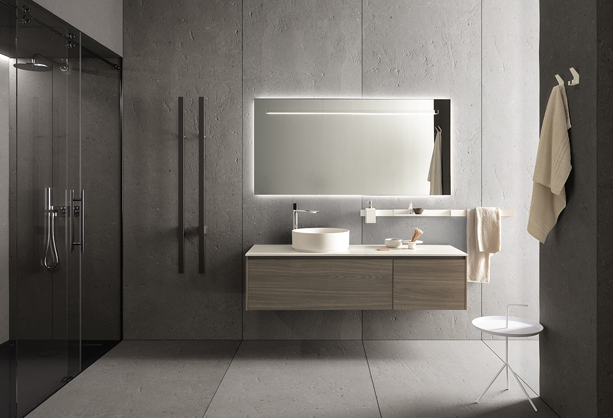 FILUX – Mirror with a recessed satin aluminum frame and LUX lamp mounted on the front. No socket or switch included.