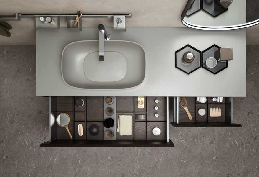 ROVERE FIAMMATO TARTUFO WITH DETAILS KAKI MATT LACQUERED. TOP AND SINK ROCK-UP GEACRYL COLOR MATT KAKI. MIRROR LUMIÈRE WITH LIGHT INSIDE THE BLACK METAL PROFILE.