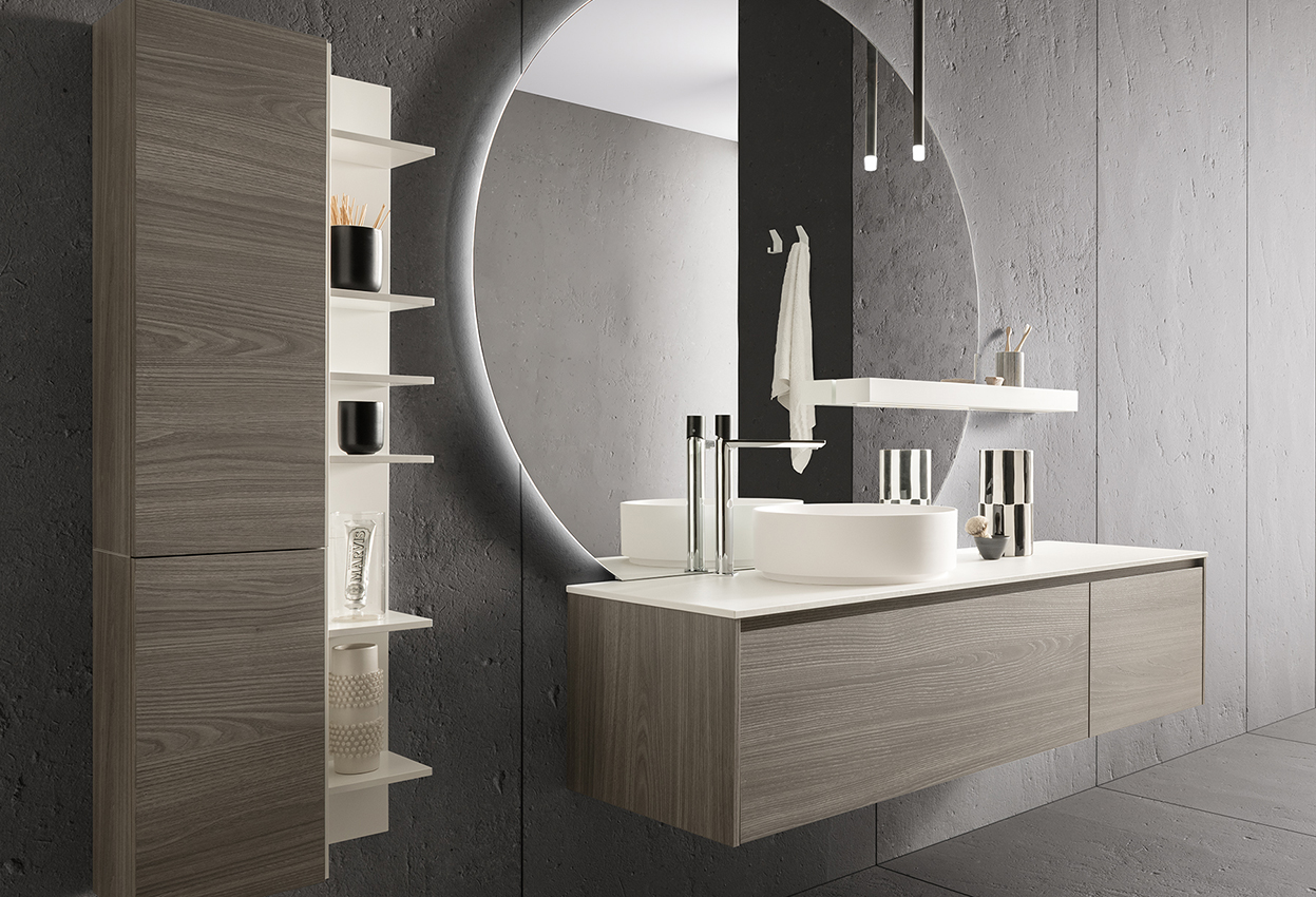 MEZZAFIAMMA GRIGIO WITH DETAILS WHITE LACQUERED. TOP GRES ARDESIA BIANCO A SPACCO AND SINK POP-UP DEIMOS WHITE MATT. MIRROR ALBA WITH SHELF PASS-BY.