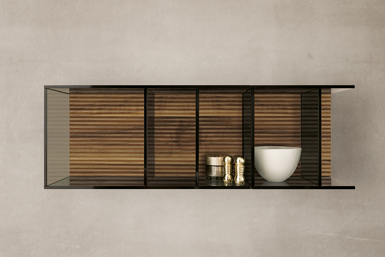 NOCE CANALETTO CANNETTATO FRONT PANELS, NOCE CANALETTO SIDES, TITANIO MATT GROOVE, SEMINATO CANDIDO NATURALE TOP, CANDIDO NATURALE CORNER WASHBASIN, LOOP MIRROR, ICE GRAY SMOKED GLASS OPEN ELEMENTS