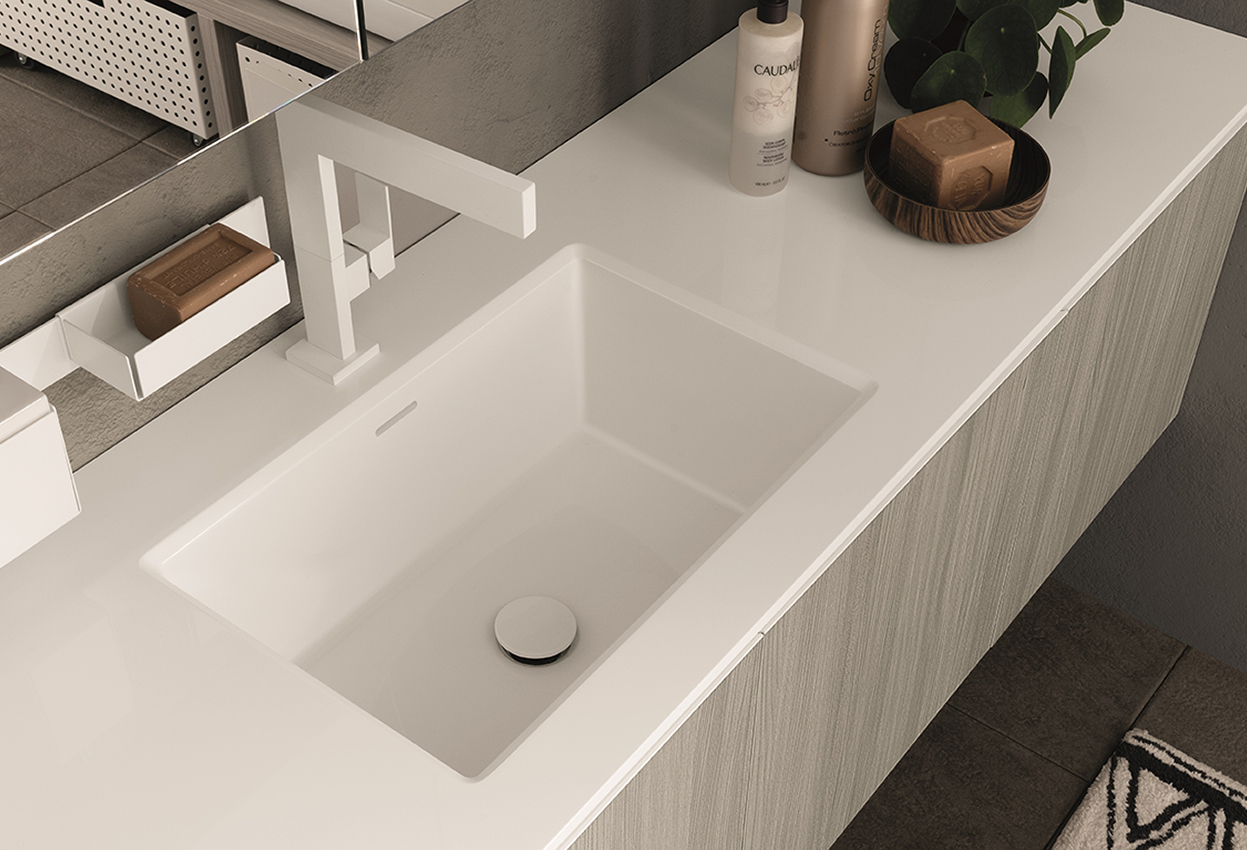 SKIN GRIGIO, POIGNÉE BIANCO, PLAN DE TOILETTE EN GEACRYL BIANCO BRILLANT, ARMOIRE DE TOILETTE AVEC LAMPE NEW, BANC EN SKIN GRIGIO ÉP.4 CM