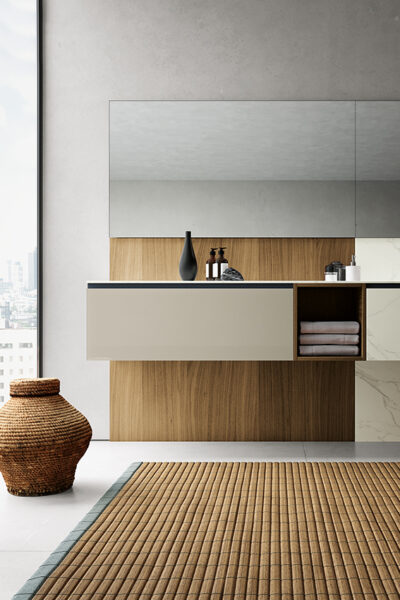 FRONTALE E TOP GRES CALACATTA SILK E VETRO LUCIDO CANAPA, PARTICOLARI NOCE CANALETTO – VASCA INTEGRATA GZZ5 – SPECCHIO FILO – LAMPADA COMPASSO