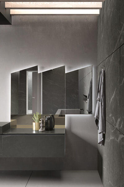 FRONTALI E TOP GRES CALATORAO SILK, PARTICOLARI LACCATI FERRO OPACO – VASCA INTEGRATA GJJ5 – SPECCHI SKY E LINE RETRO-ILLUMINATI