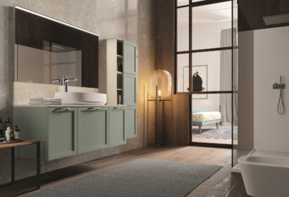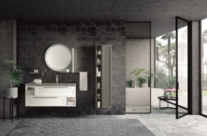 TOP TECNORIL SP. 1,2 CM – BASI FINESTRA OPACO – PASSEPARTOUT BIANCO – MENSOLA IN METALLO BIANCO – LAMPADA SFERA A LED – SPECCHIO VINTAGE L. 70 CM – VASCA INTEGRATA ACC5