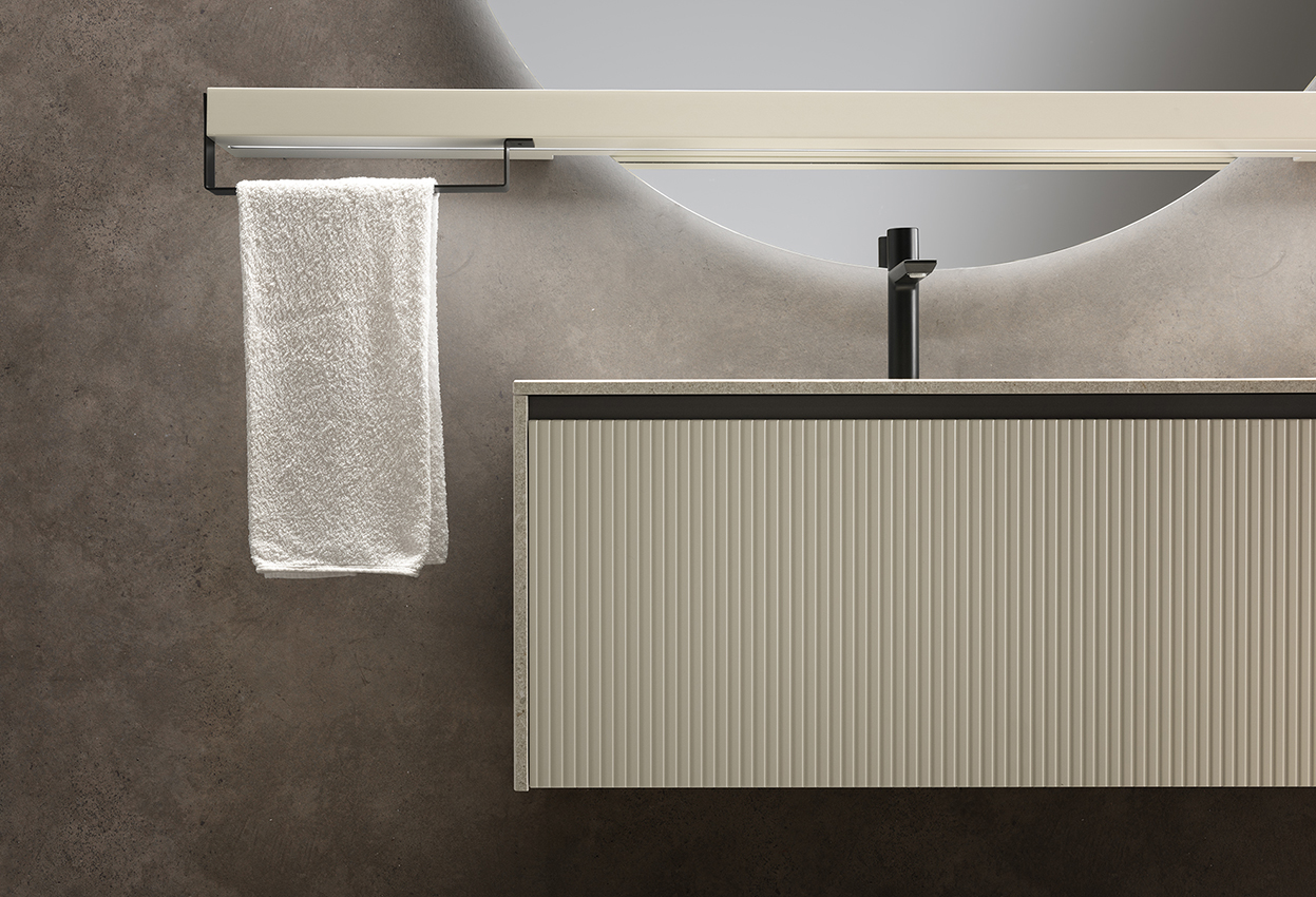 FRONTALI IN RIGATO JUTA OPACO, GOLA TITANIO OPACO, FIANCHI DI FINITURA E TOP IN GRES SHILIN SLATE – VASCA INTEGRATA GZZ5 CON SCARICO ISPEZIONABILE – SPECCHIO RAGGIO RETROILLUMINATO – LAMPADE A SOSPENSIONE ROSSINI – MENSOLA PASS-BY LACCATA JUTA OPACO CON ILLUMINAZIONE LED – PORTASALVIETTE UNDER VERNICIATO TITANIO OPACO